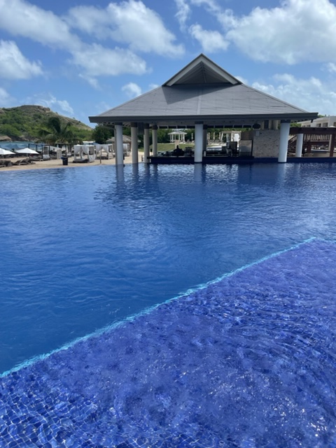 Galley Bay Resort & Spa is an adults-only all-inclusive resort with 98 rooms, all but 14 are ocean front. The 14 that are not are absolutely beautiful with their own plunge pools. When pulling up to this resort, there is a very unassuming front desk and a view of their lagoon. You take a golf cart to get to your room and this resort takes you back in time with an actual key – no key cards here. Many of their rooms are updated though some of their rooms have yet to be updated but they are large, clean rooms with amazing views. They have a beach grill, 2 restaurants and one restaurant with an upcharge of $45 per person. While they do not have room service, you can request the day before to have breakfast in your room. This property also has 4 bars, a Rum Bar, non-motorized water sports, coffee and gift shop, nightly entertainment, yoga in their pavilion overlooking the beach, a gift shop, a Diamond shop (many ladies have been known to take their men to the Rum Bar to drink then the Diamond shop to purchase). Coming to Galley Bay, you are on an absolutely beautiful stretch of beach and you feel the authentic vibe of Antigua. The service is wonderful. This is for a traveler looking for tranquility.